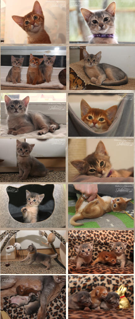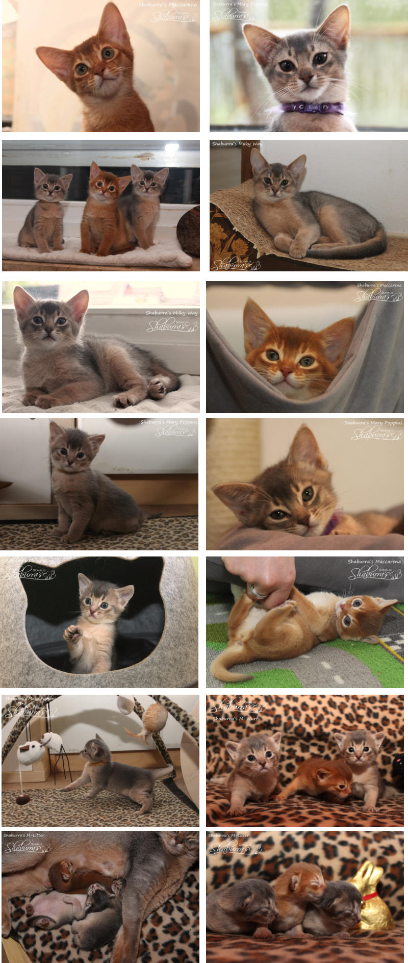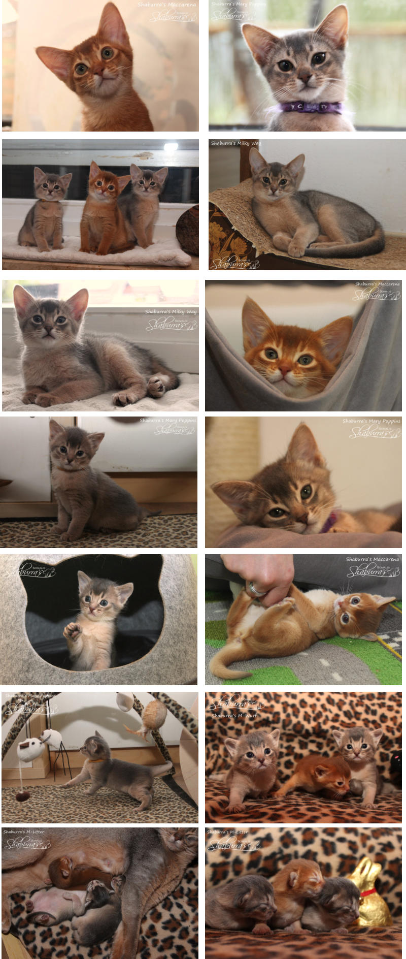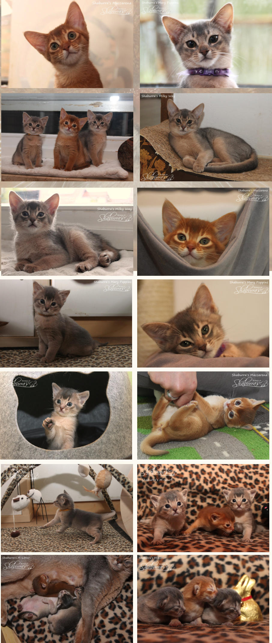 Geboren am 26.03.2021 Eltern: Eigerin`s Charisma (Abessinier) x Somalissa Easy Elisey of Shaburra (Somali) Alle Babys sind Abessinier Varianten (Kurzhaar Somalis) Maccarena Abessinier Variant  - sorrel- weiblich (ausgezogen) Mary Poppins Abessinier Variant  - blue- weiblich (ausgezogen) Milky Way Abessinier Variant -  blue- männlich (ausgezogen)