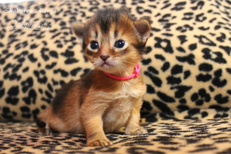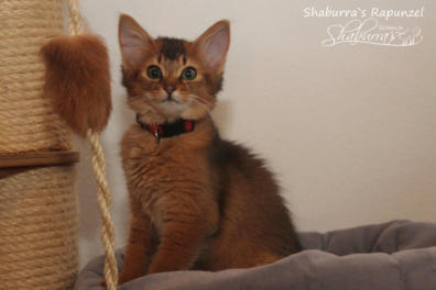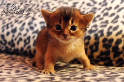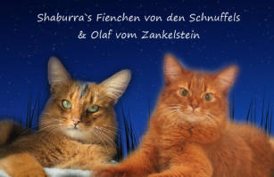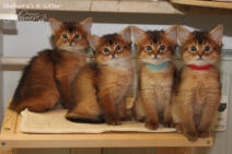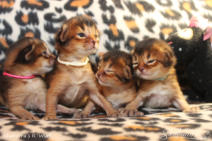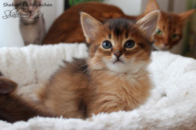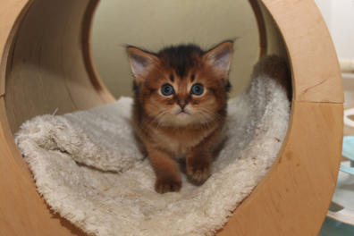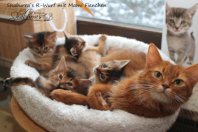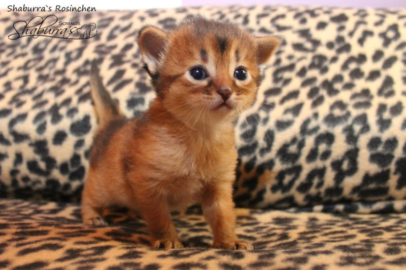 Nach fast einem Jahr Kittenpause… bekam ich langsam aber sicher Kitten-Entzugserscheinungen.Daher freue ich mich riesig, dass es mit der Deckung unseres Prinzesschen Fienchen mit dem tollen Olaf geklappt hat.Herausgekommen sind aus diesem Date 4 wildfarbene/ ruddy Somalibabys, die Fienchen zwar ein einer langen, aber absolut komplikationslosen Geburt das Leben schenkte.Anfangs war ich erschrocken über das kleinste Baby im Wurf… knapp über 60g… so ein kleines Mini-Mäuschen hatte ich noch nie und ich war gewappnet für evtl. hochpäppeln und Zufüttern…Aber die kleine Maus - das Rosinchen (der Name musste sein) hat das auch alleine alles geschafft und zeigte vom ersten Tag an im wahrsten Sinne des Wortes ihr Krallen. Alle drei nehmen kontinuierlich zu und so langsam herrscht Leben in der Wurfbox und dann gaaaanz bald im Kitten-Kindergarten und der restlichen Wohnung.Wir freuen uns riesig auf diese Kittenzeit im Herbst/ Winter.. genau die richtige Jahreszeit für Babys, wenn man ohnehin wieder mehr im Haus ist…